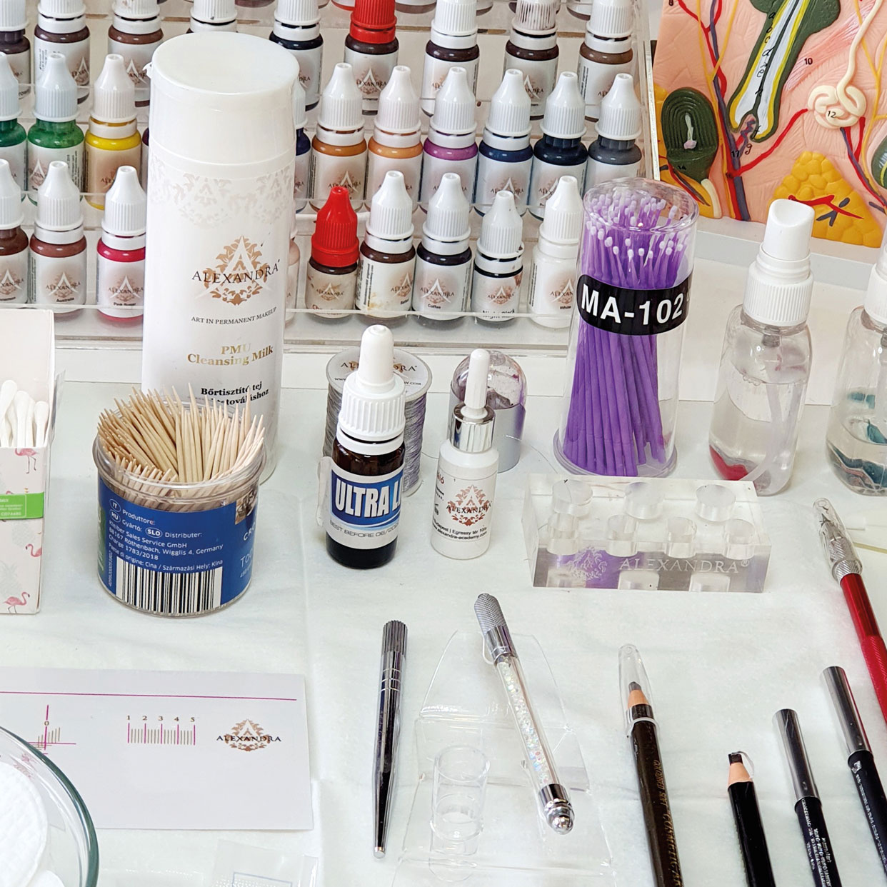 Az érzéstelenítő hatóideje alatt kiválasztjuk vendégünknek a színt és konzultálunk a formáról. Ha ezzel megvagyunk, akkor előkészítünk minden olyan eszközt és kelléket, amely szükséges az adott munkához. A modellemnek M-es és U tűvel készítettem a szemöldöktetoválást valamint Alexandra Caramel és Cool Light Brown pigmentek keverékével.