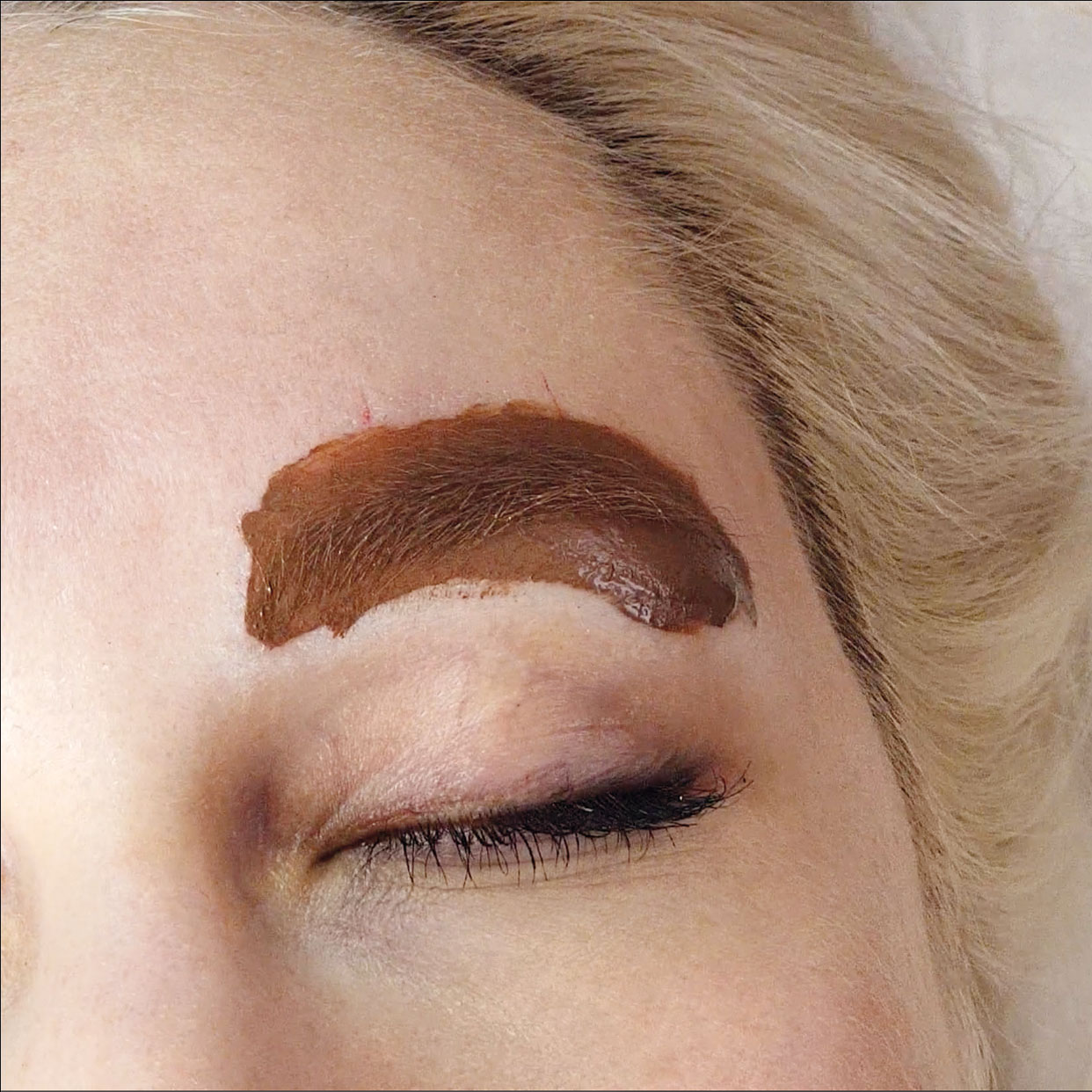 A fehérrel kijelölt rész határait barna ceruzával meghúzom, ezzel kiemelkedik az új szemöldök forma. A fehér ceruzát elsatírozom.  A formán kívül eső szőrszálakat pedig eltávolítom. Így egyértelművé válik az a terület, amelyet szálakkal fogok dúsítani a modellen természetes szálirányainak megfelelően.