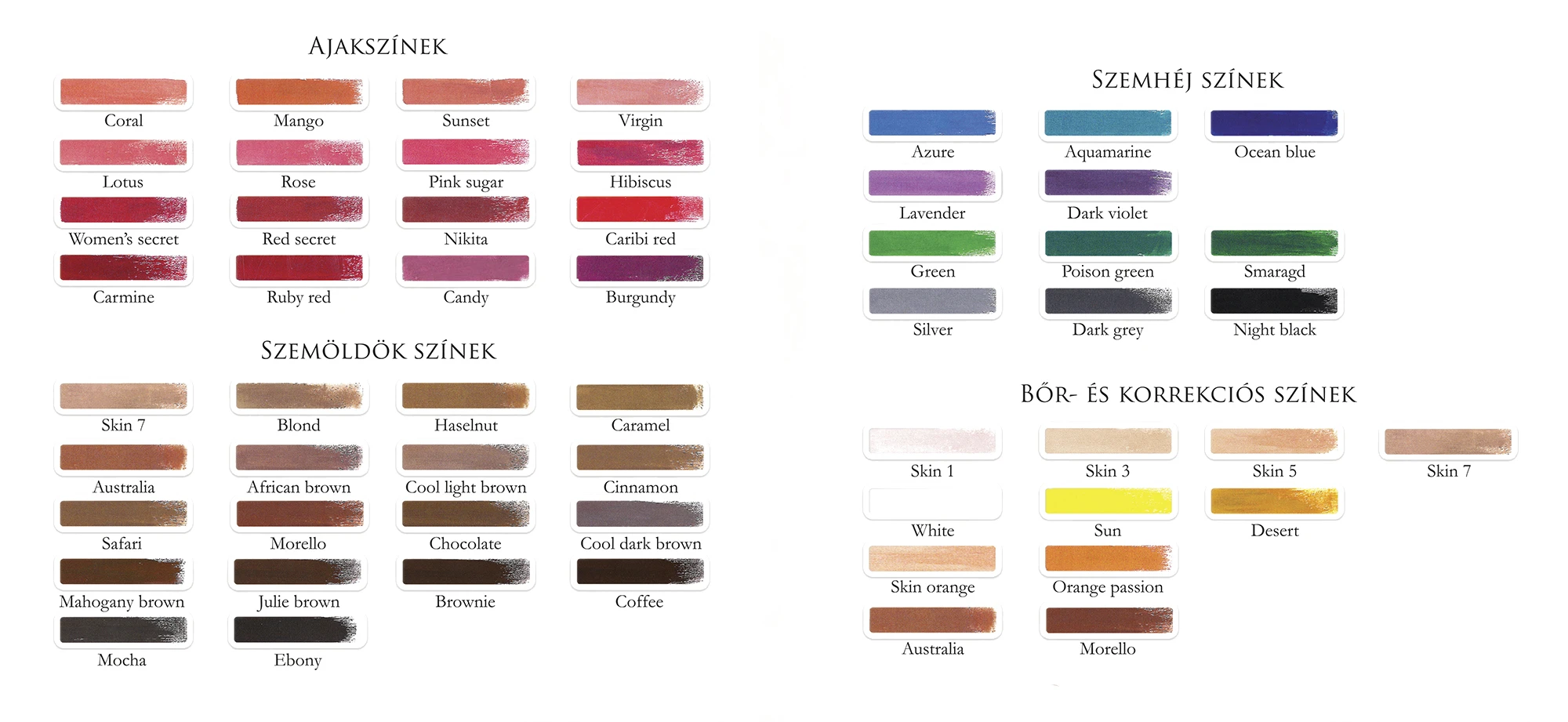 Tudtad, hogy a magyaroknak is van egy egyedi stílusuk? A 56 szín összeállításakor is, saját igényeimen túl a sminktetoválóktól összegzett információkat is figyelembe vettem. Olyan színpalettát állítottam össze, melyben egyaránt megtalálhatóak a melegebb, a hidegebb, a természetesebb és az élénk árnyalatok is. Kollégáimmal hosszú hónapokig teszteltük a színek tulajdonságait és válogattuk, kísérleteztük ki a legoptimálisabb színeket. A színek bátran keverhetők, alakíthatók, melegíthetők vagy semlegesíthetők, ezzel további egyedi lehetőséget adva a sminktetoválók kezébe. A szájszínek frissek, természetesek, élethűek és könnyű velük dolgozni. A legújabb sminktetováló technikák elkészítéséhez, mint 3D szájsatír, Butterfly szemhéjsatírozás is rendelkezésre állnak különleges színek és árnyalatok. Szükséged volna egy színre, de egyik sminktetováló márka palettáján sem találod? Mi segítünk benne! Oszd meg velünk igényeidet és megtanítunk, hogyan keverd ki vagy elkészítjük és megrendeljük számodra!